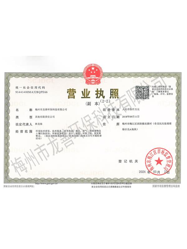 梅州市龍善環保科技有限公司為龍善環保股份有限公司(簡稱“龍善環?!保┳庸?。龍善環保于1995年12月成立,注冊資本為人民幣6,000萬元,總部位于深圳市南山區月亮灣大道2078號兆龍大樓16層。公司經生態環境部、廣東省生態環境廳、深圳市生態環境局、深圳市交通運輸委員會、深圳海事局等部門許可專業從事陸地和海洋環境保護產業的高科技民營企業,主要經營業務包括工業廢物收運、資源化利用和無害化處理處置、海洋船舶污油水接收和集中處理處置、突發環境事故清污應急處置等......